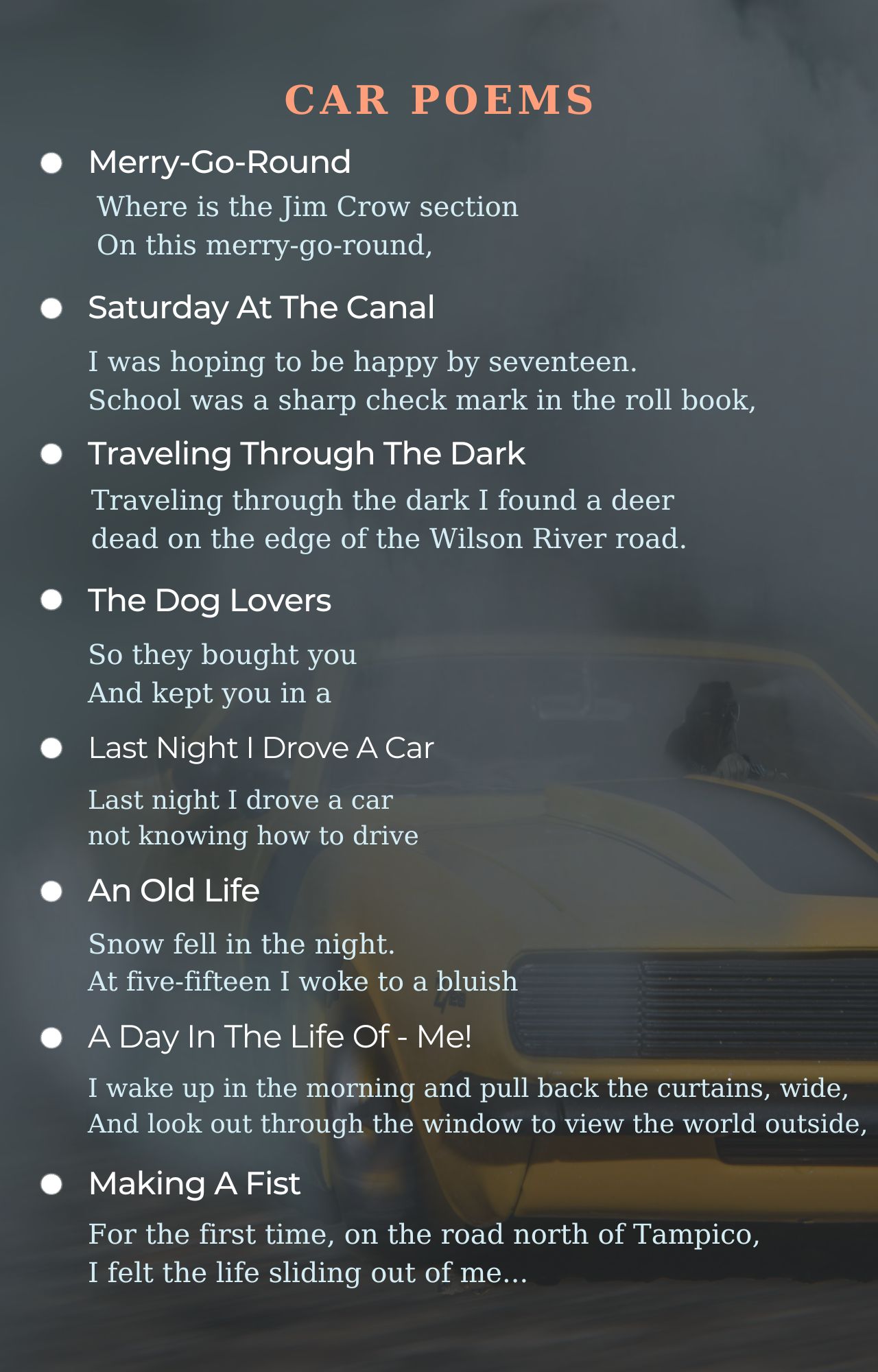Car poems from famous poets and best beautiful poems to feel good. Best car poems ever written. Read all poems about car.