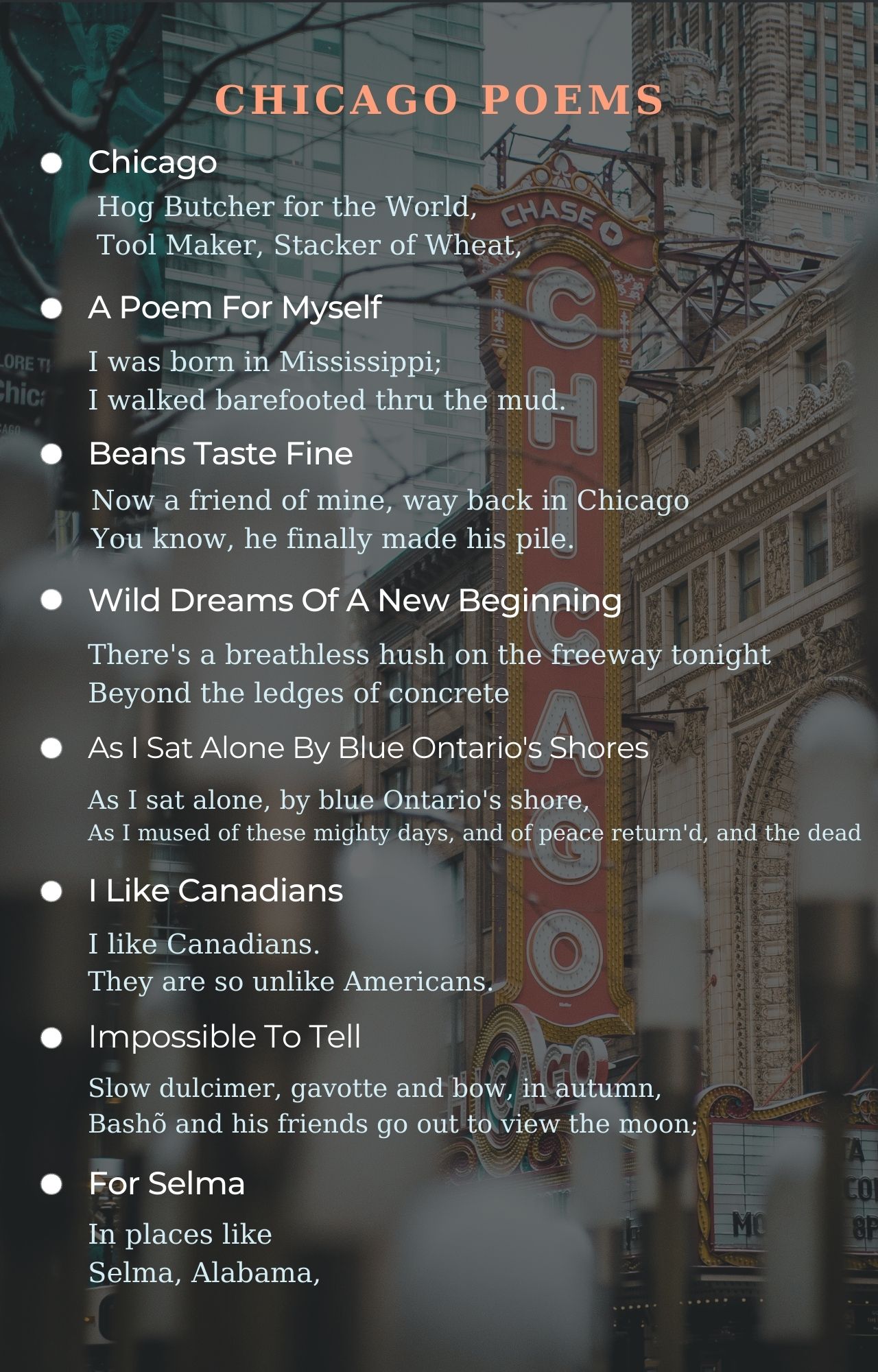 Chicago poems from famous poets and best beautiful poems to feel good. Best chicago poems ever written. Read all poems about chicago.
