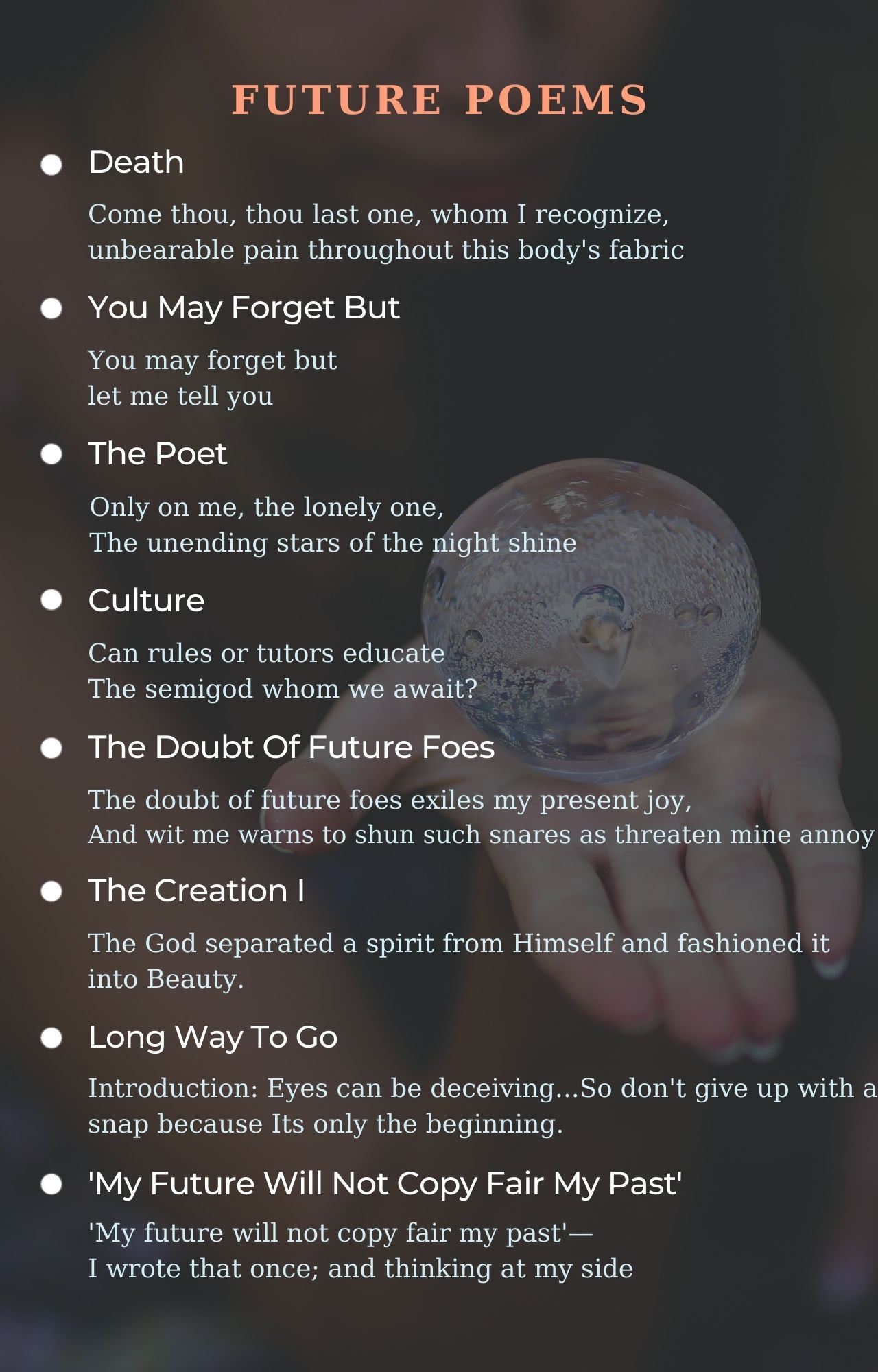Future poems from famous poets and best beautiful poems to feel good. Best future poems ever written. Read all poems about future.