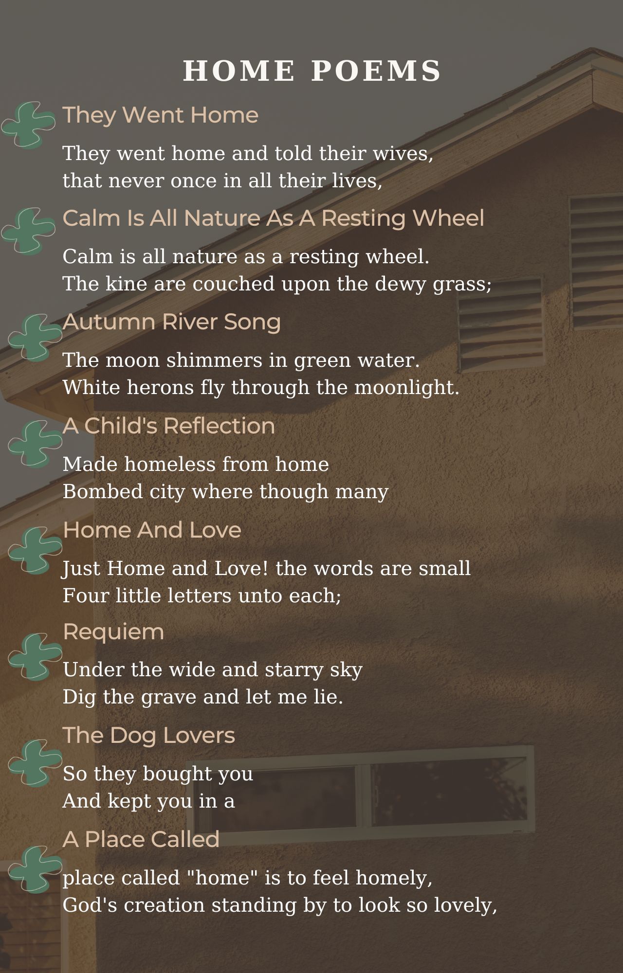 Home poems from famous poets and best beautiful poems to feel good. Best home poems ever written. Read all poems about home.