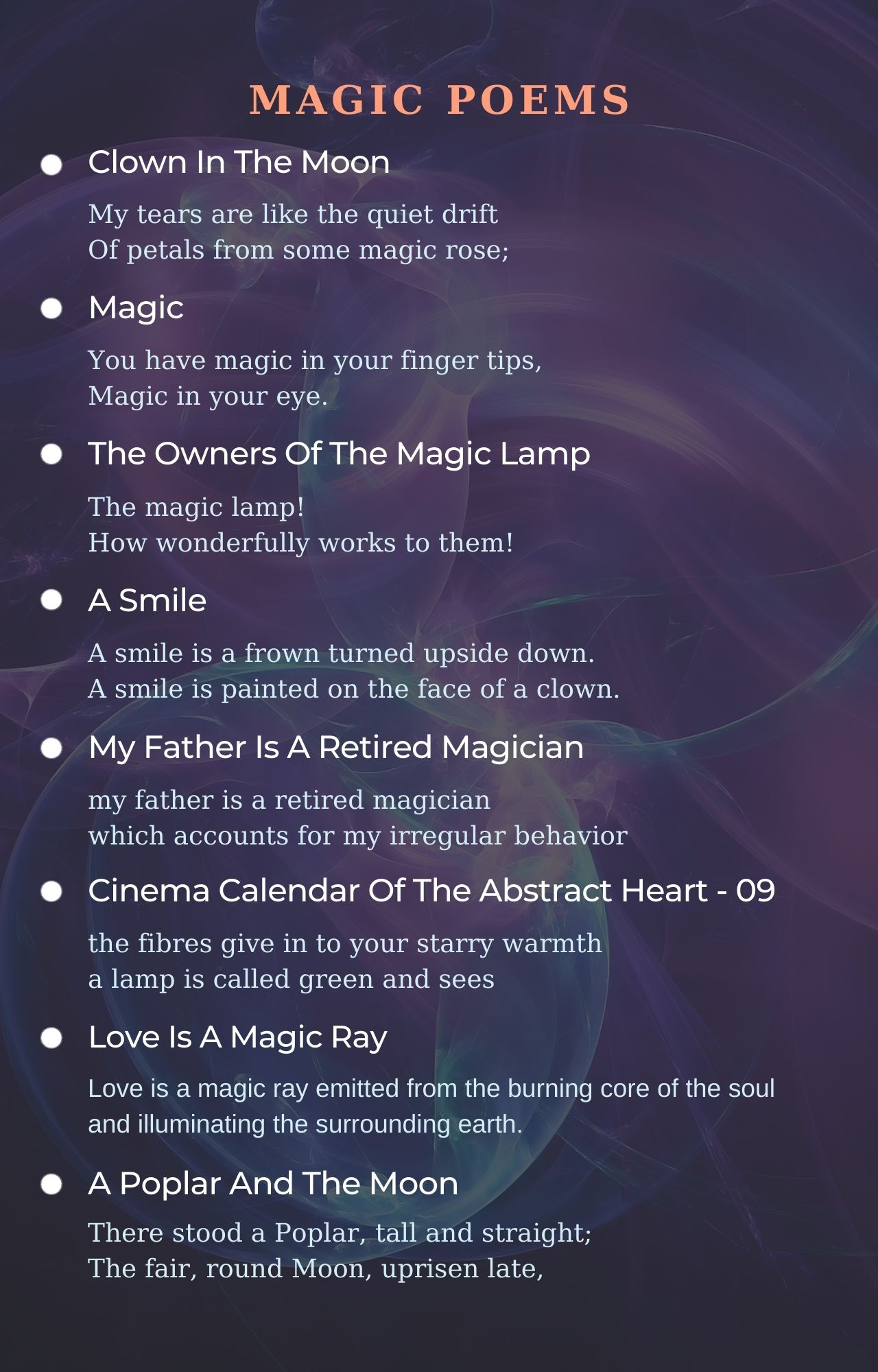 Magic poems from famous poets and best beautiful poems to feel good. Best magic poems ever written. Read all poems about magic.