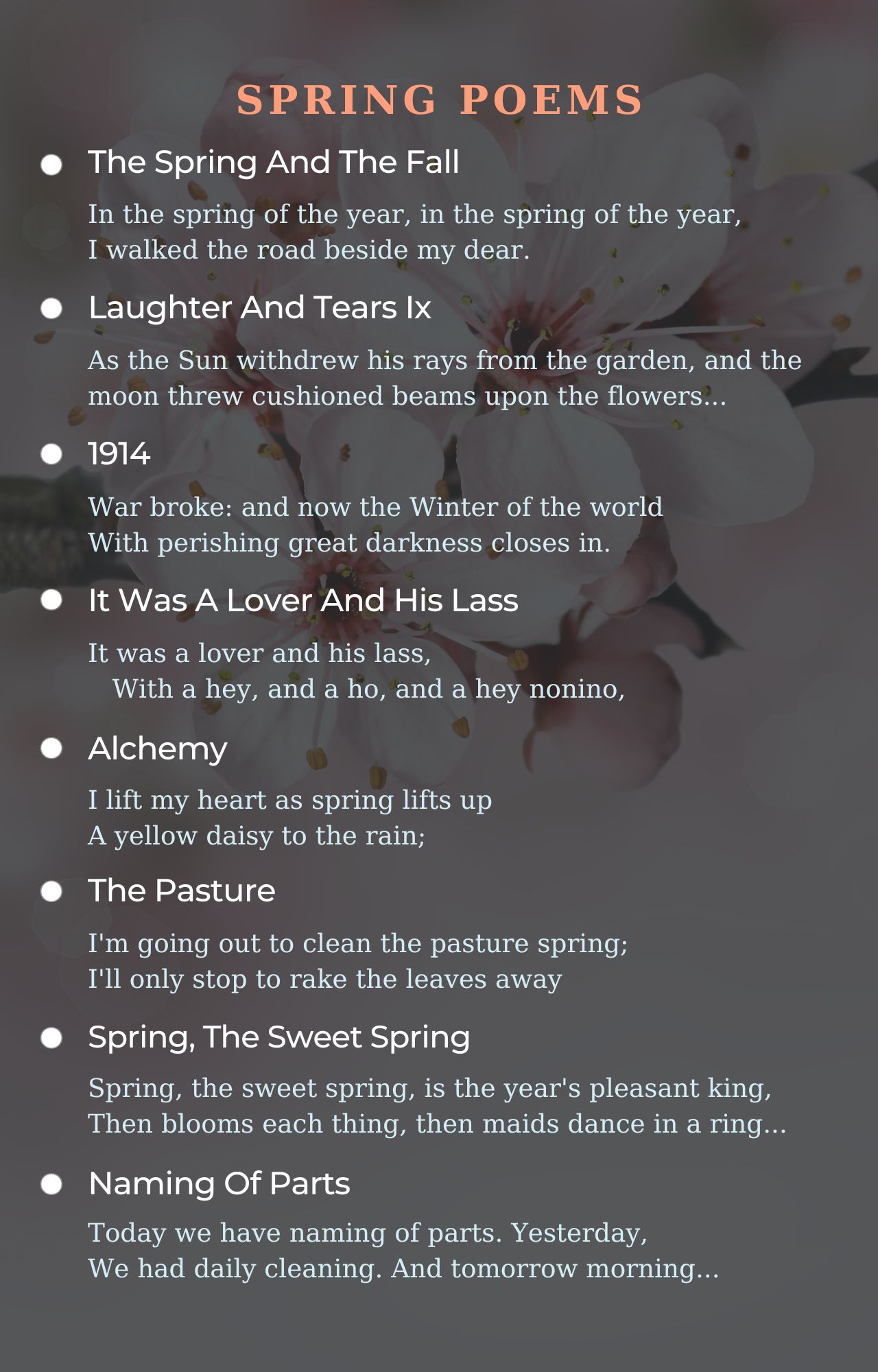 Spring poems from famous poets and best beautiful poems to feel good. Best spring poems ever written. Read all poems about spring.