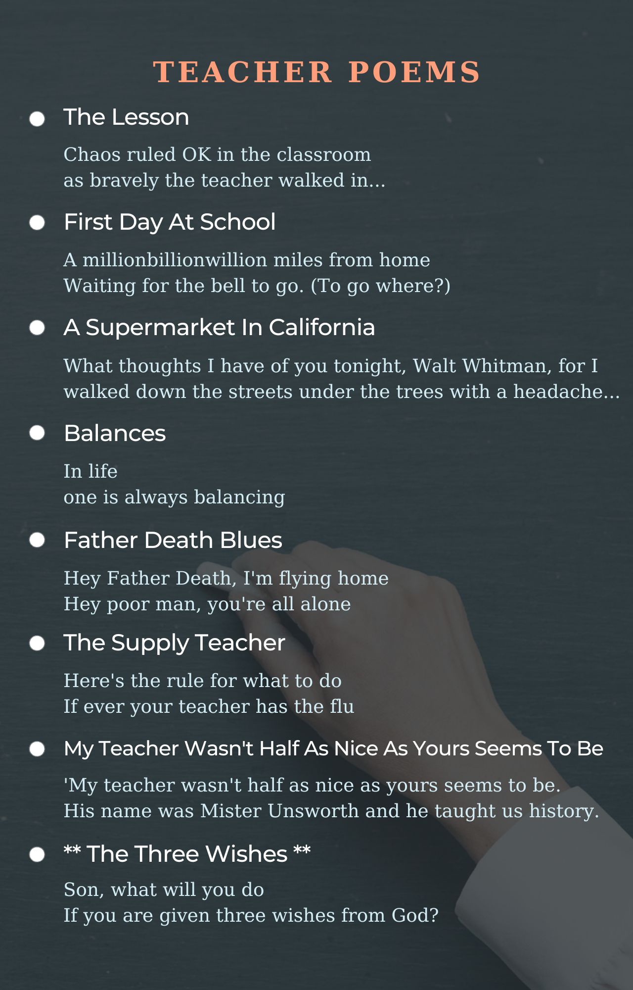 Teacher poems from famous poets and best beautiful poems to feel good. Best teacher poems ever written. Read all poems about teacher.